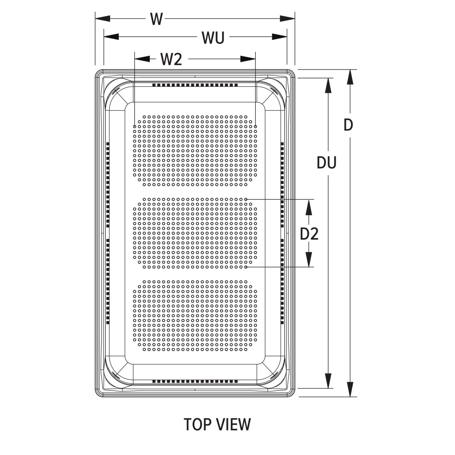 - 4-mm (5/32-inch) drain holes on the bottom of pan only